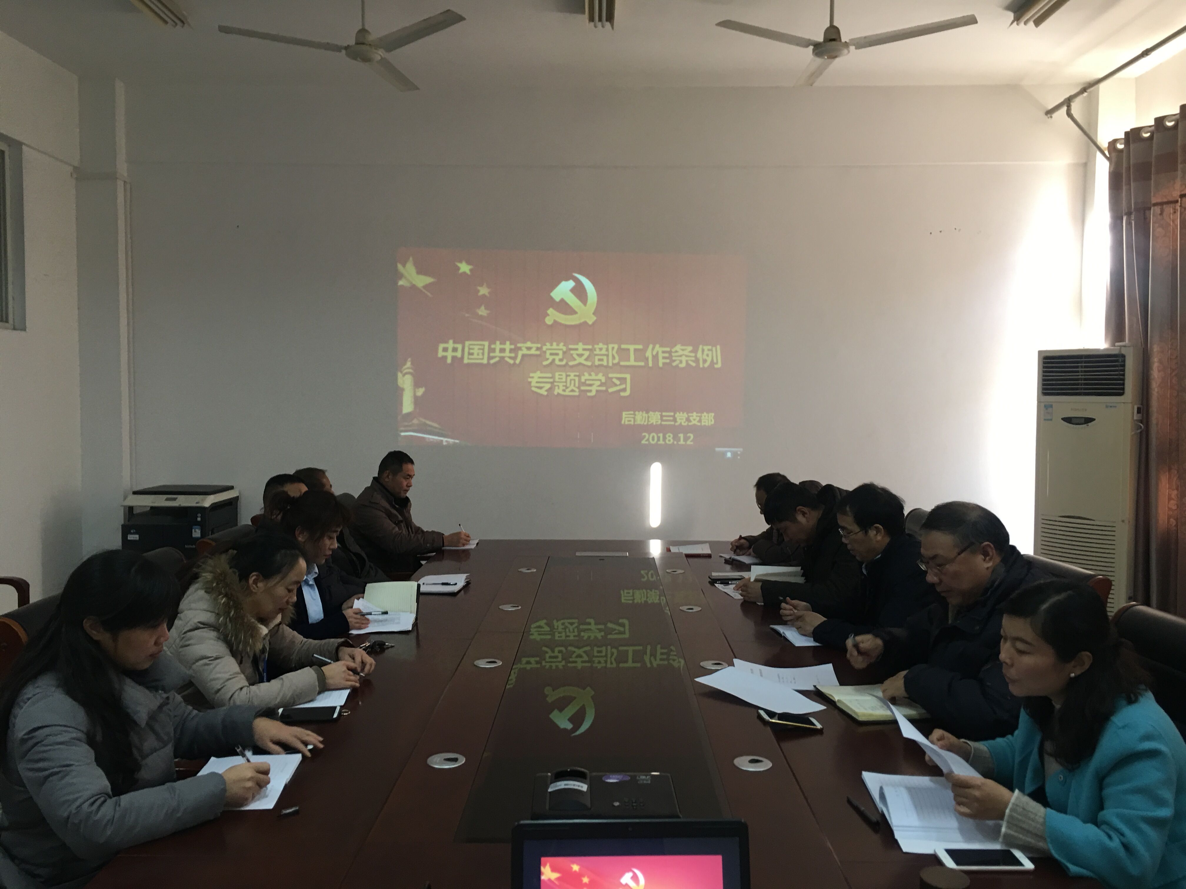 后勤党总支副书记杨宏楼带领大学原文学习了《条例》,并围绕着支部工作的职责定位、组织调置、组织生活、支委会建设、党员教育管理等方面进行了阐释。